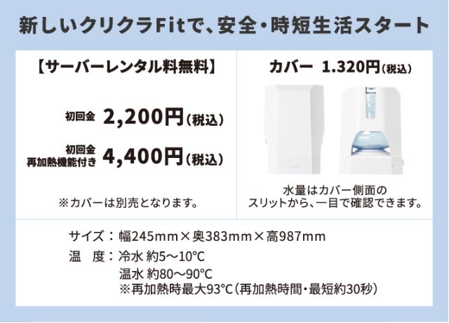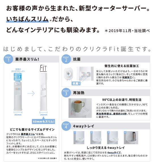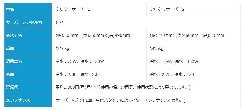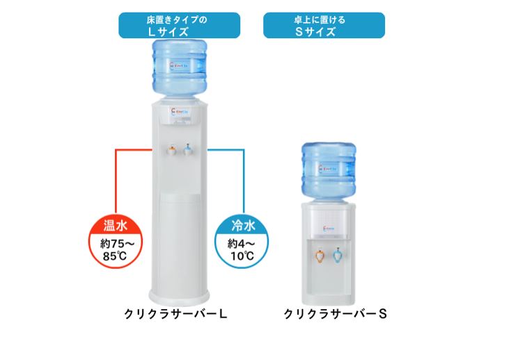 クリクラのサーバーは、L型とS型の2種類をご用意。設置場所や、お使いいただく シーンに合わせてお選びいただけます。もちろん、ご家庭のリビングやキッチンに も設置できるサイズですので、お子様のいるご家庭や、毎日の水分補給を手軽に求 められる皆さまにも気軽に利用していただけます。